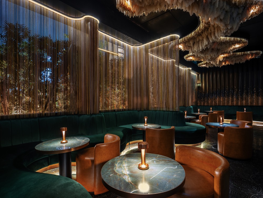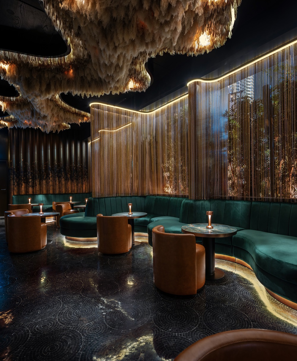 Agora’s standout feature is the stunning bead curtain hanging from the ceiling. These carefully arranged and suspended beads serve as a dynamic visual centrepiece, adding an element of intrigue and movement to the space and encouraging patrons to engage with the design on a sensory level.