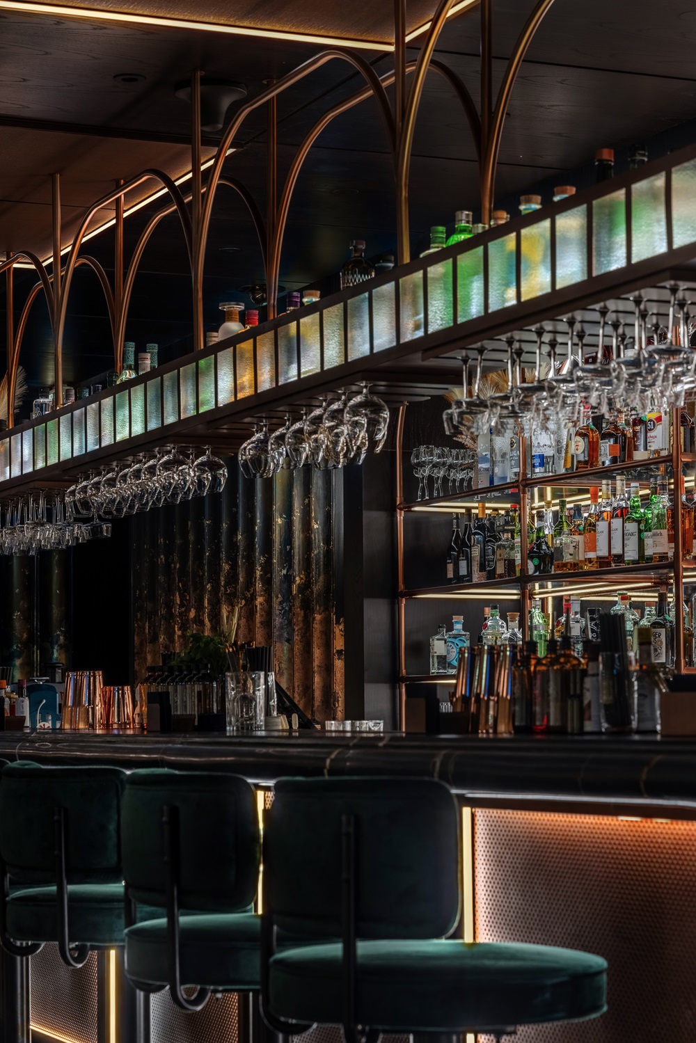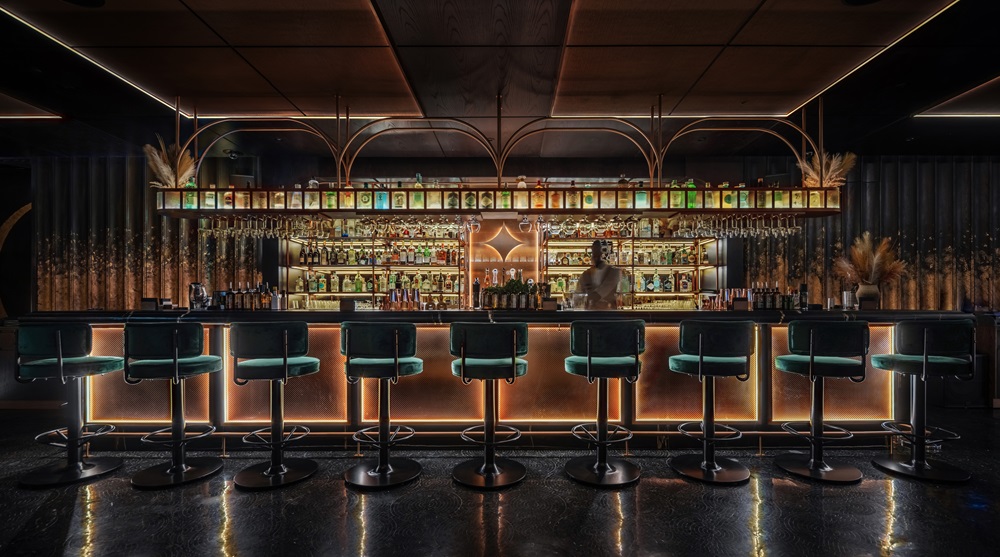 Agora is defined by its exceptional use of custom-made furniture, including cylindrical chairs and elegant bar chairs. These pieces elevate the ambiance, enhancing sophistication and luxury without ostentation.