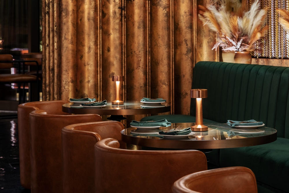 Agora’s color palette is thoughtfully curated to evoke a sense of luxury and timelessness. It includes forest green fabrics for a touch of mystery and richness, subtle copper accents to add warmth and elegance, and Indian green marble tabletops that infuse the space with classical beauty and timeless grandeur.