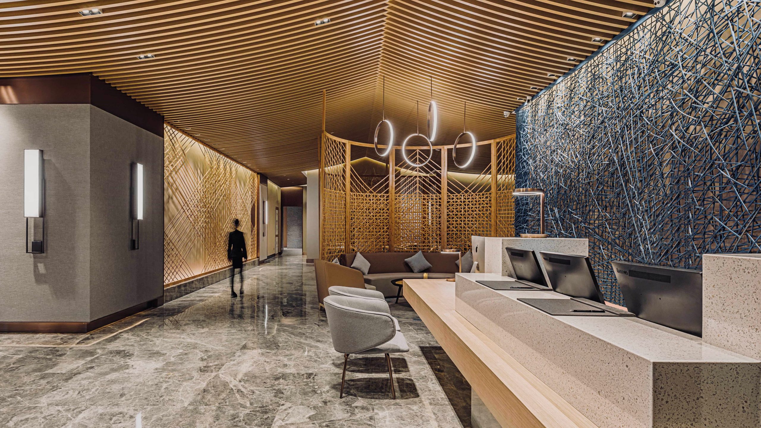 Double height central courtyards were introduced on every two guest-room floors. A reflective lake with a bamboo installation of dancing curves falls naturally, as if clouds are floating in the air. This ceiling-hung structure, produced in consultation with bamboo masters, is curved by making use of its natural elasticity and traditional connection method. Guests will experience the feeling of passing through an abstract bamboo forest before arriving at their rooms.