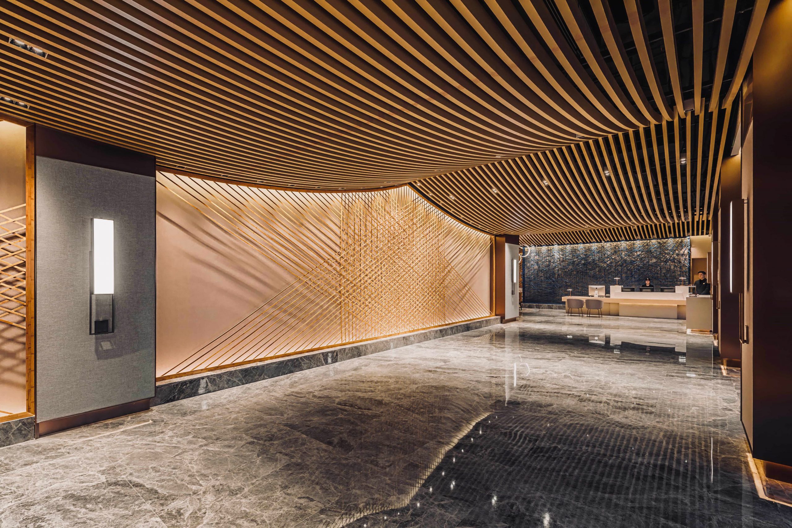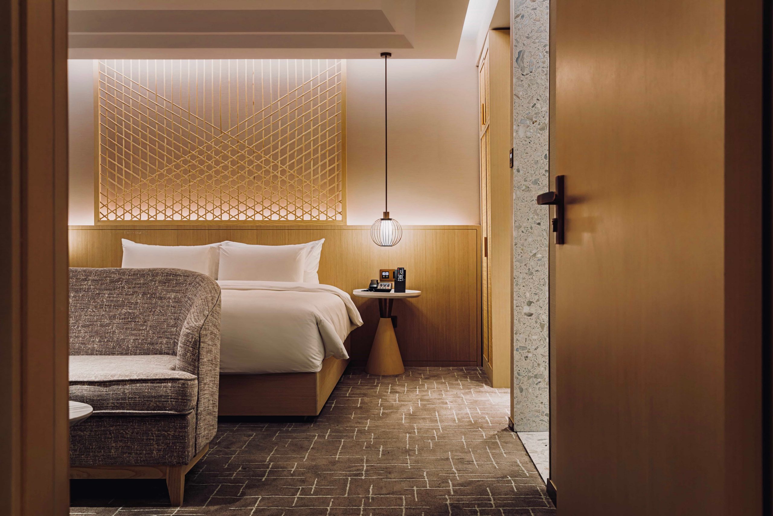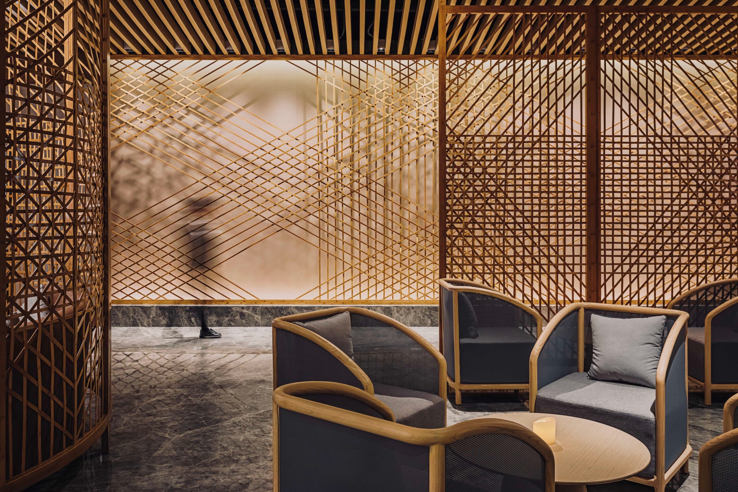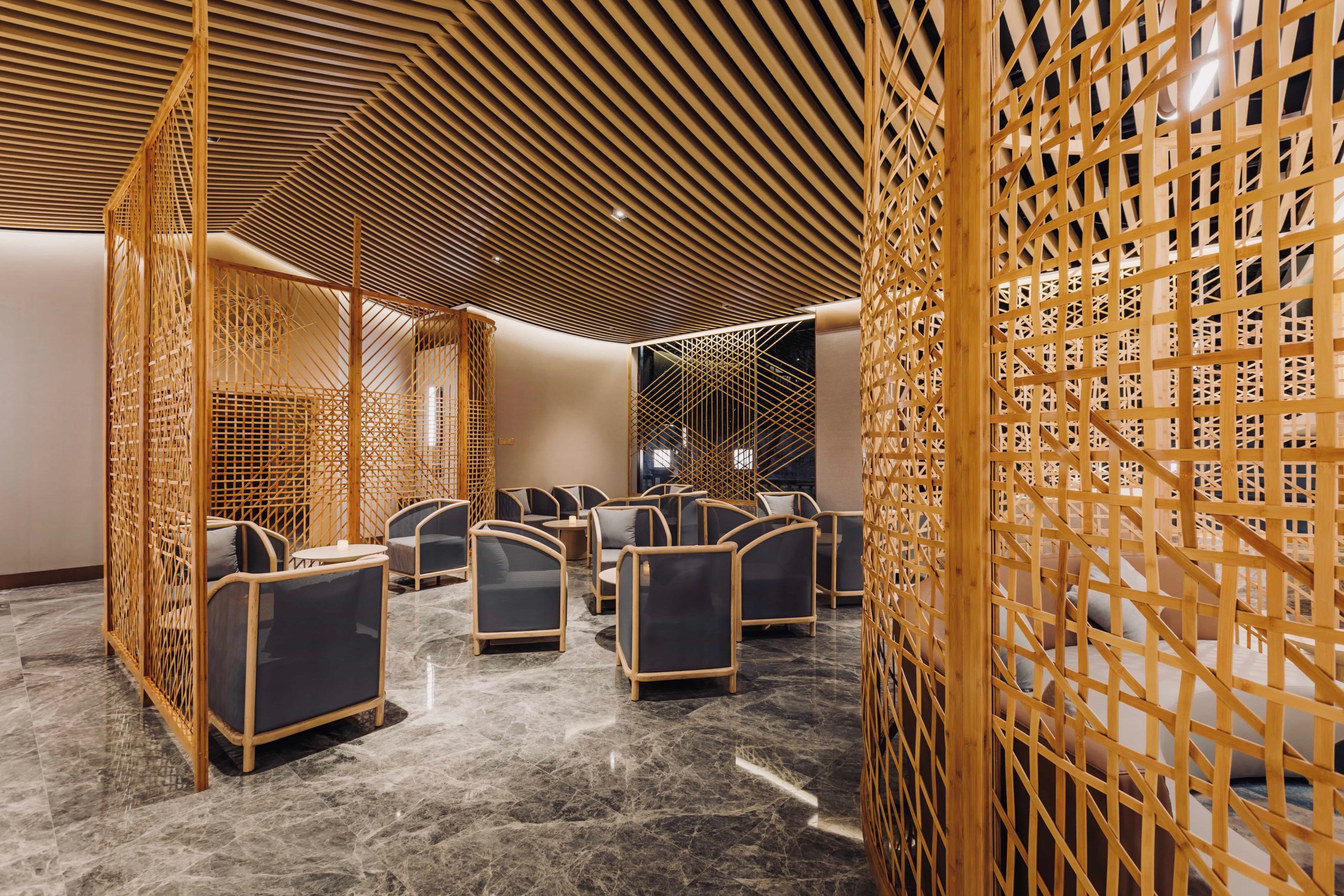 Starting from the lobby, bamboo was selected as the key material and contributes to a lobby space that greets visitors with sophisticated light and shadow effects on the main wall. Various on-site tests & experiments with traditional bamboo weaver were done to create full height screens to define the reception and lobby lounge areas. A pitched roof ceiling and natural diatom mud finished walls, overlaid by articulated light and shadow effects, provide a minimalist leisure experience for the entire space.