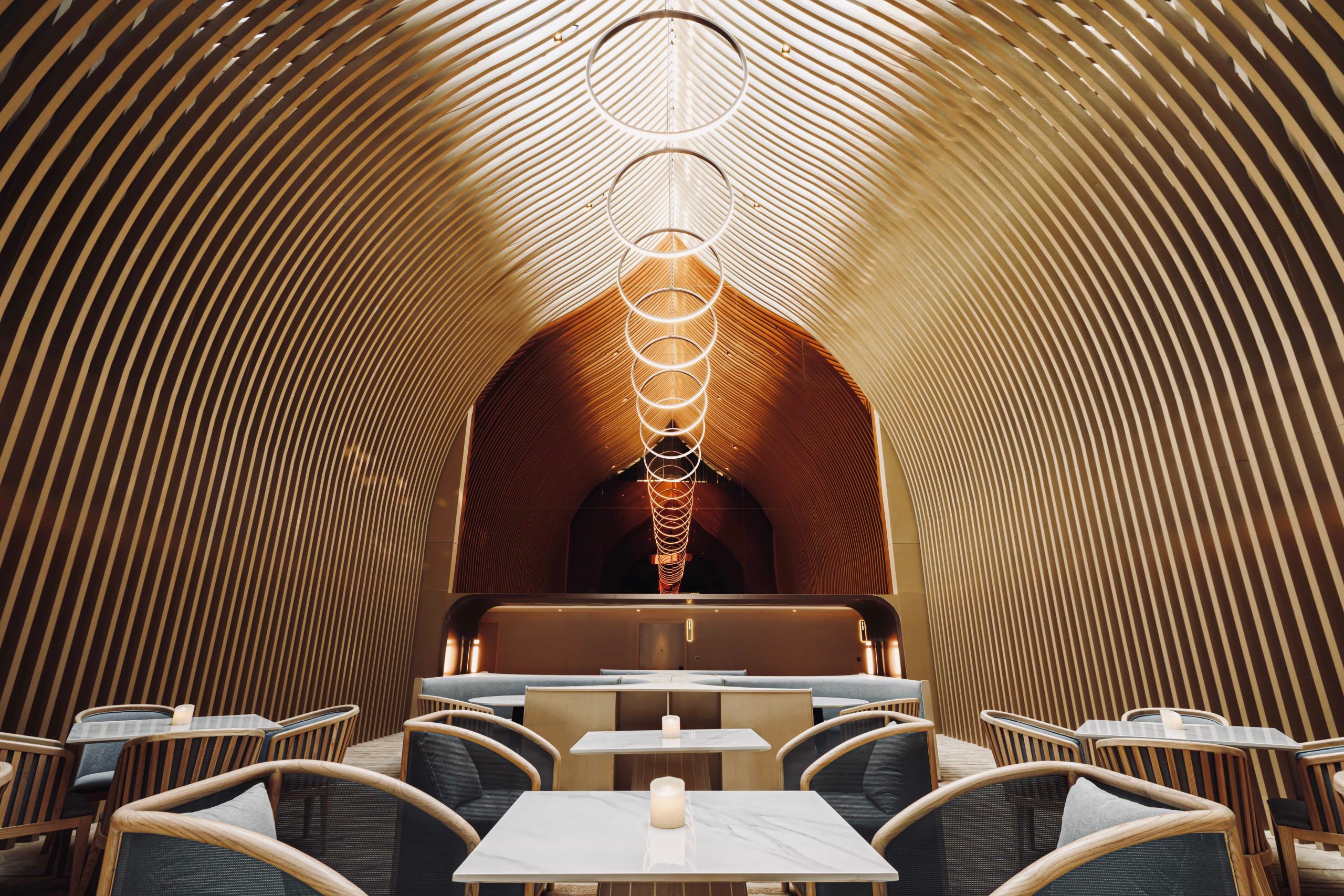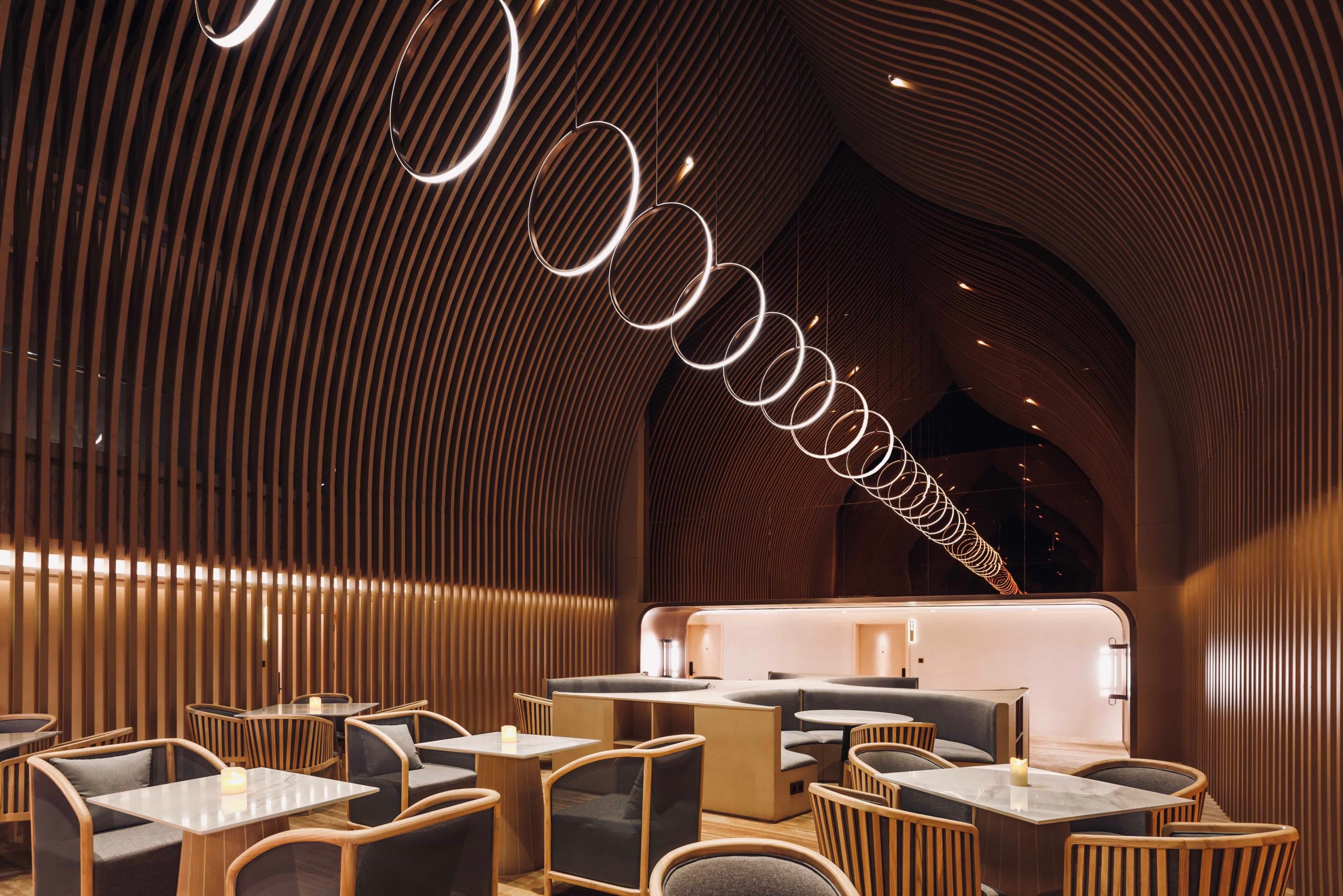 Sky Café is located on the top floor and is a zen and church-like space constructed as a full height bamboo structure. A skylight above allows natural light to descend through the middle of the seating area during the daytime. Ceiling suspended circular LED lights form a set of endless glowing moons, providing guests with a poetic nighttime experience.