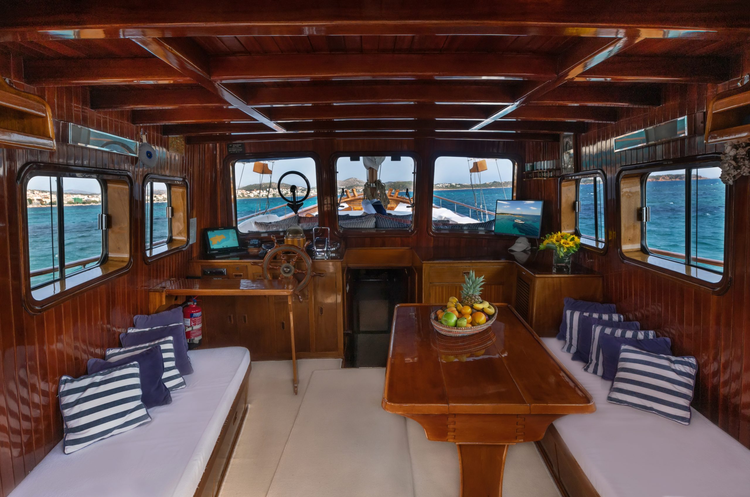 With 3 air-conditioned guest cabins on the lower deck (1 generously-sized master cabin with 1 double and 1 single beds, and 2 twin cabins), STAVROS can ideally welcome up to 7 guests onboard overnight and 12 guests when cruising. There are 2 additional sleeping spaces on the bridge. She also comes with independent crew quarters in the bow.